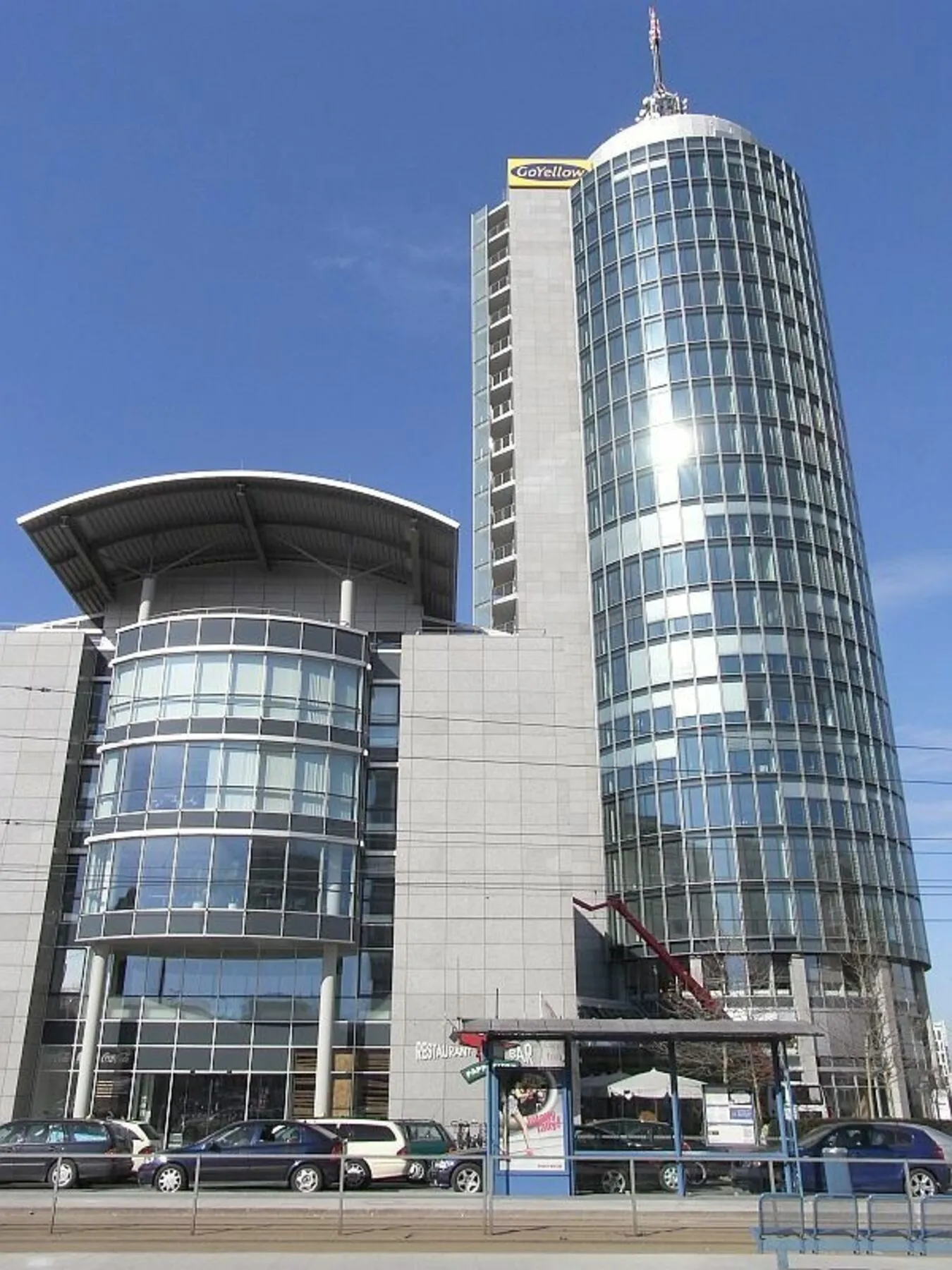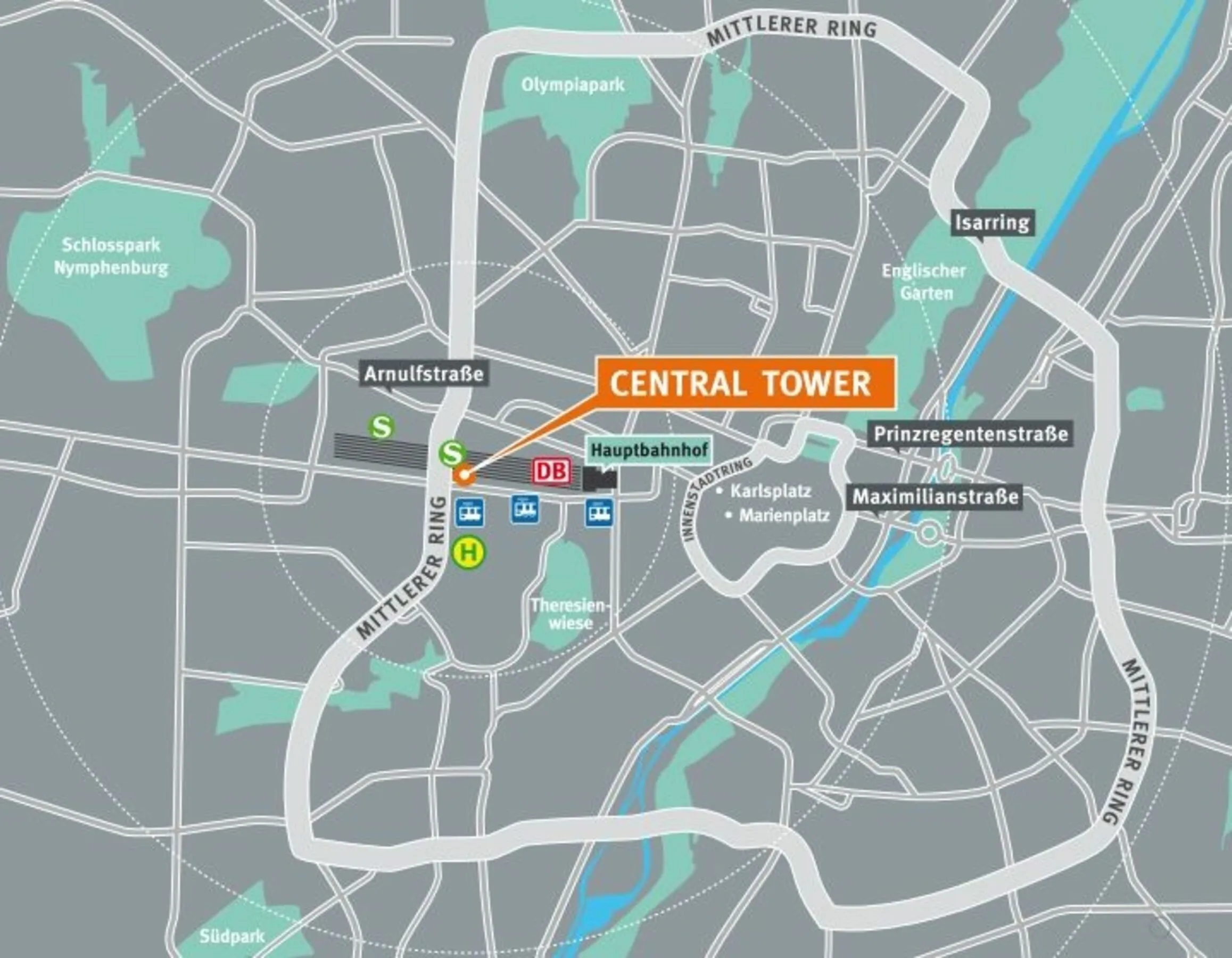 sechsgeschossigen Flachbau (Plaza) einen außergewöhnlichen Blickfang im Münchner Westend dar. An der zentralen Bahnlinie (S-Bahn-Stammstrecke) und am Mittleren Ring gelegen, ist es werbewirksam weithin sichtbar und den vielen Reisenden in Auto, Bus und Bahn bekannt.